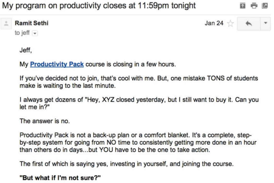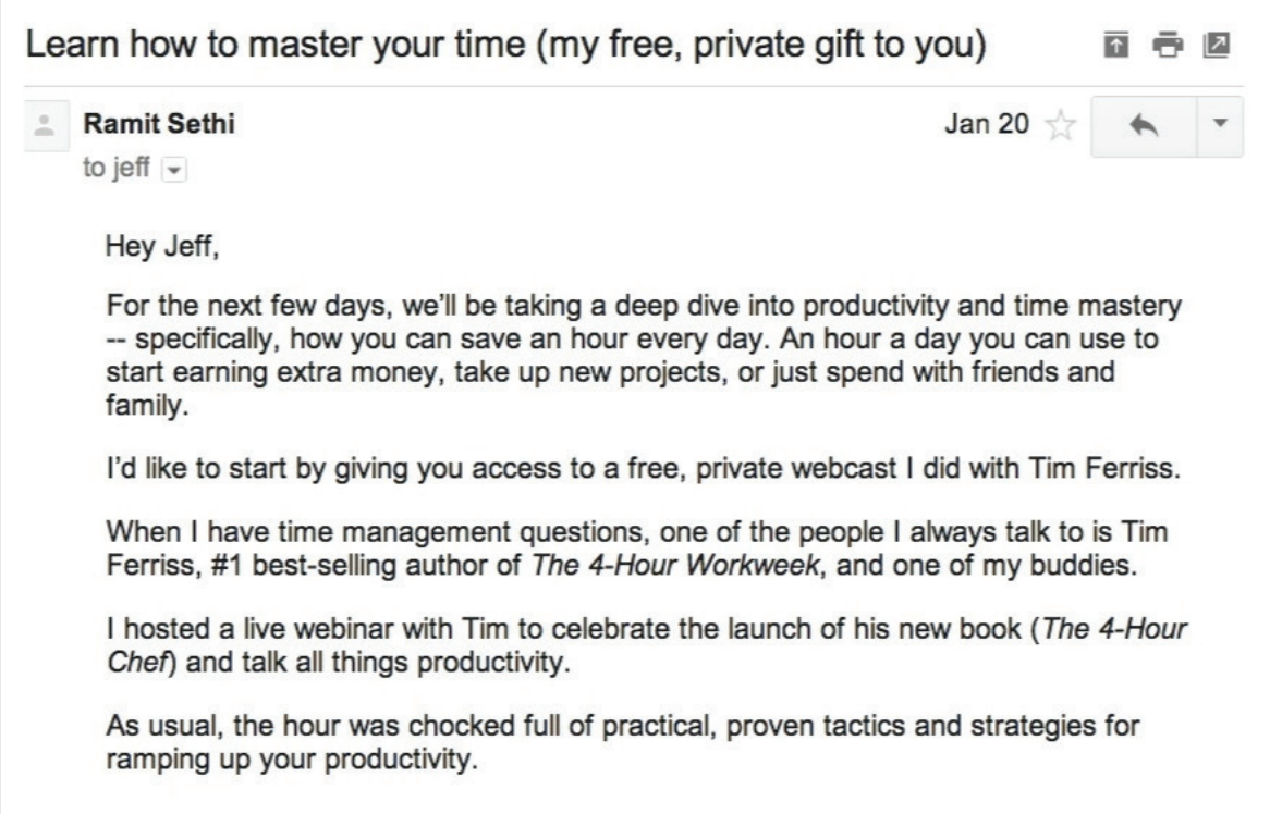 Par exemple, Ramit Sethi commence sa séquence de répondeur automatique par un message électronique amical et informatif :