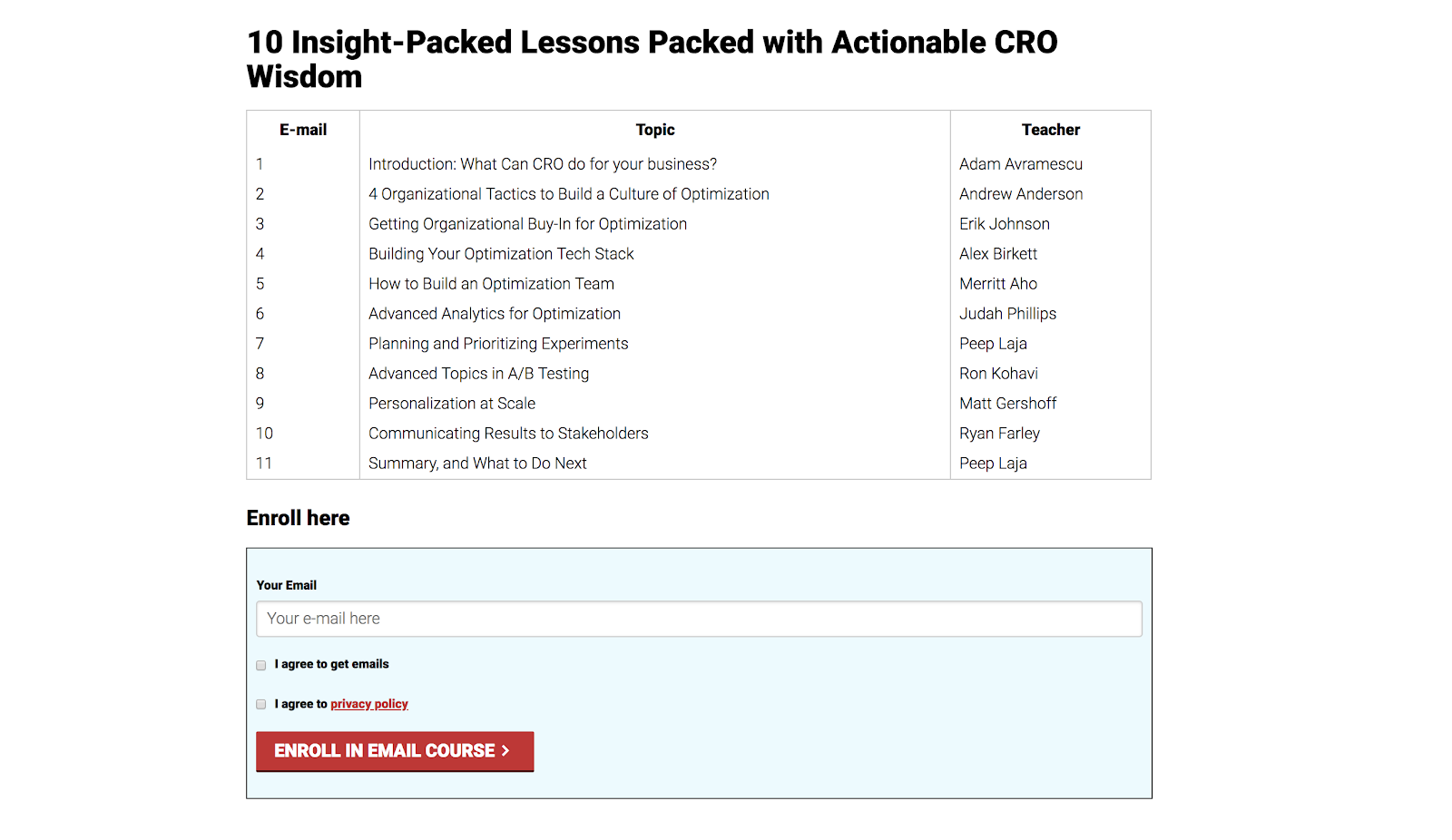 CXL, par exemple, utilise un cours de messagerie électronique “optimisation de la conversion d’entreprise” pour inciter les gens à s’inscrire à leur liste. Le livrable n’est qu’une séquence temporelle de leçons par e-mail – en d’autres termes, un répondeur automatique.