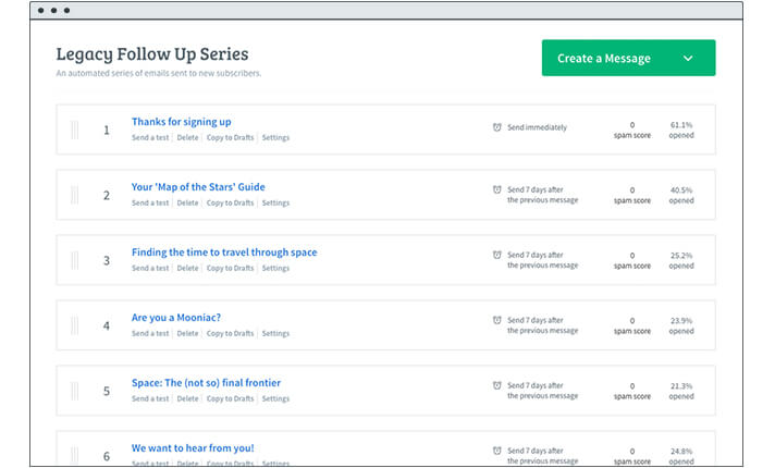 Vous pouvez choisir le nombre de messages qui apparaissent dans une séquence de répondeur automatique et vous pouvez choisir quand ils sont livrés. Par exemple, certaines séquences de répondeur automatique n’ont qu’un seul message de suivi, qui est parfois juste un message de « remerciement » pour s’être abonné à la liste de diffusion :