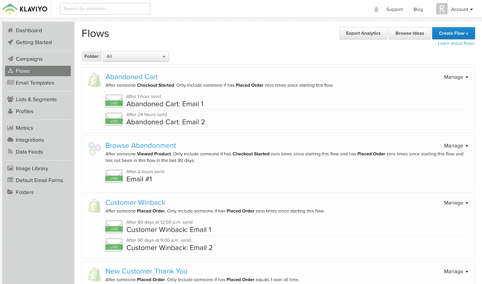 Avec Klaviyo, vous pouvez déclencher une séquence d’e-mails de répondeur automatique pour pratiquement tous les événements que vous pouvez mesurer (tant que vous avez l’adresse e-mail du contact). Cela ouvre toutes sortes de possibilités, telles que les e-mails de panier abandonné, les e-mails de remerciement après un achat, les enquêtes de satisfaction client après une fenêtre de temps après un achat et les e-mails de vente croisée pour un certain article acheté.