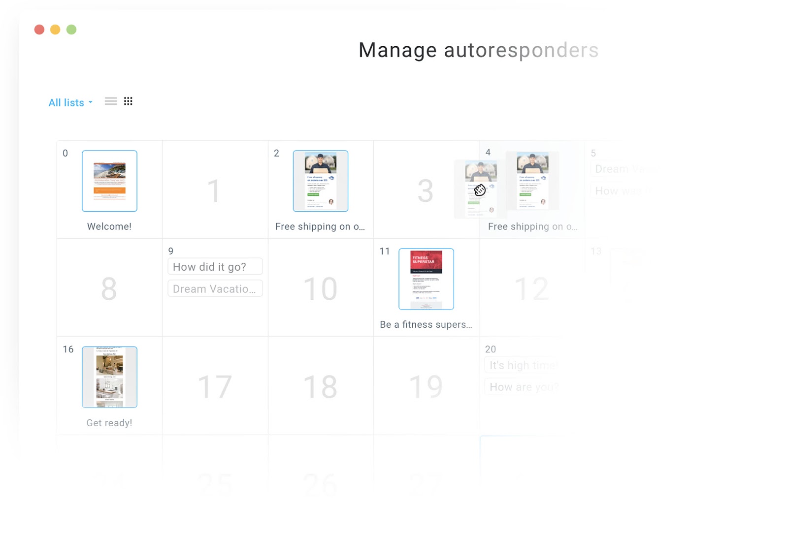 Bien que l’exécution puisse être assez différente selon votre entreprise, votre secteur d’activité et vos objectifs, tous les répondeurs automatiques vous permettent d’automatiser les séquences d’e-mails en fonction du calendrier et du formulaire d’inscription par e-mail.