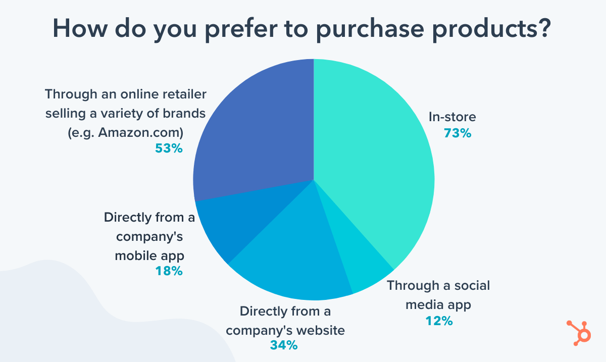 Cependant, 73 % des personnes (et 55 % de la génération Z en particulier) déclarent qu’elles préféreraient toujours acheter un produit en magasin. Il s’agit d’un appel important : bien que vous souhaitiez vous concentrer sur les médias sociaux pour vos efforts de génération de prospects, il est toujours essentiel d’avoir une option d’achat en magasin solide et efficace pour ceux qui souhaitent effectuer la vente finale en personne. .