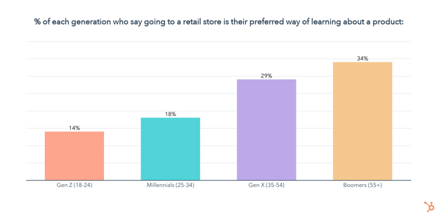Arrivant en deuxième position, 27 % des consommateurs déclarent préférer se renseigner sur les produits dans les magasins de détail. Sans surprise, l’approche en personne est la plus populaire parmi les groupes d’âge plus âgés, bien qu’elle ne soit pas complètement perdue pour la génération Z et qu’elle soit toujours préférée par près d’un millénaire sur cinq.
